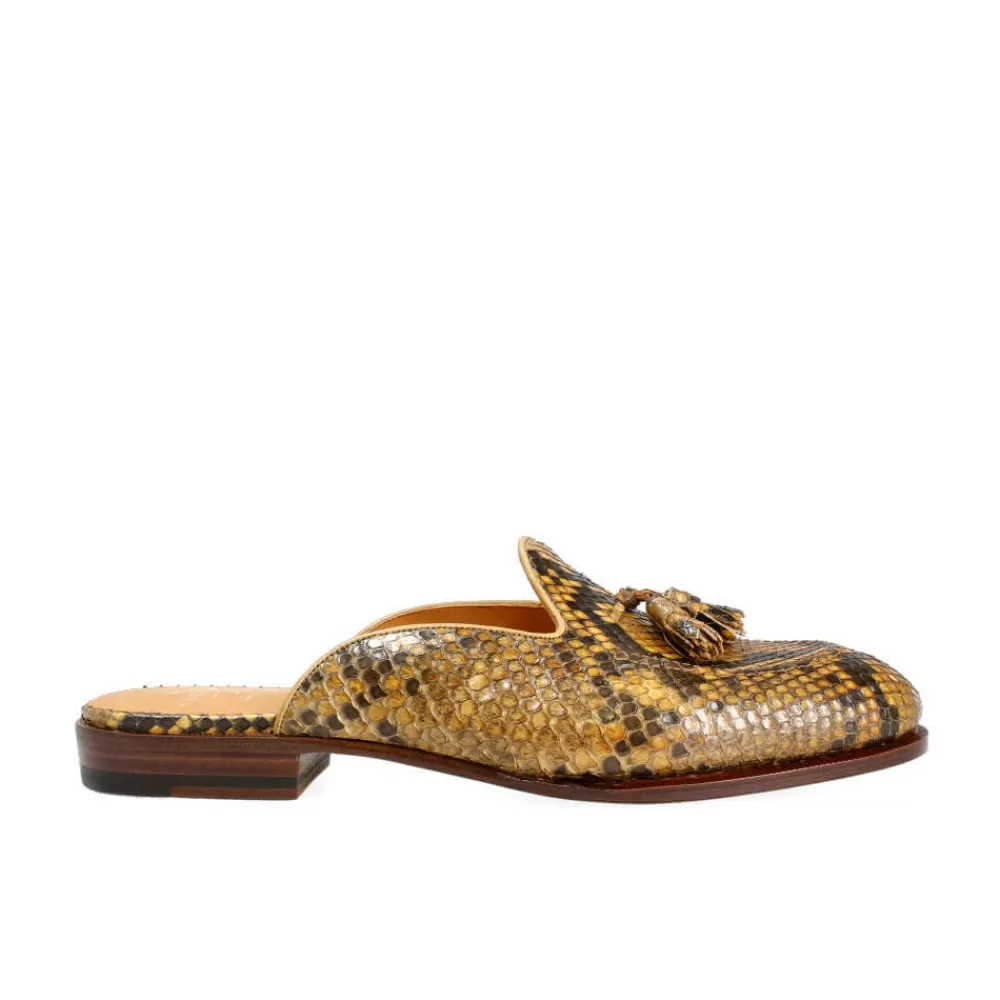 Mules de borlas de mujer en pitón camel.Acabado con una suela de cuero de alta calidad con el logotipo estampado de Car…