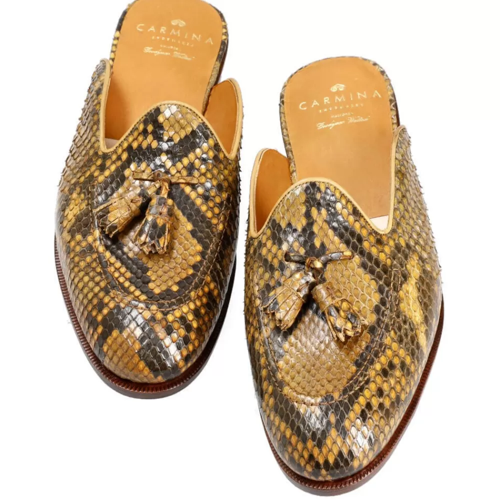 Mules de borlas de mujer en pitón camel.Acabado con una suela de cuero de alta calidad con el logotipo estampado de Carmina y forro de becerro.Este zapato, al igual que todos los Carmina, está manufacturado cuidadosamente por artesanos expertos los cuales siguen las técnicas que Charles Godyear creó en 1869.Para este modelo hemos utilizado nuestra horma Drac 20. Horma de punta redonda y bajo empeine. Perfecta para mocasines de poco calce.